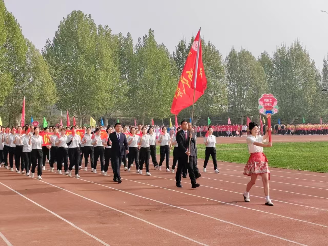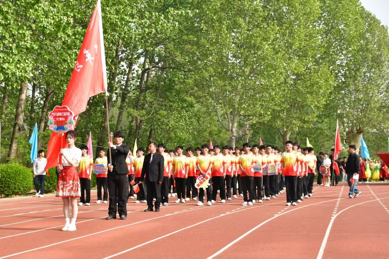 队伍最前方,是身姿挺拔的引导员,手持引导牌,引领着整个方阵。其后,旗手身姿矫健,高擎院旗,院旗在微风中猎猎作响,庄重而威严。紧随旗手的是李经理,他面带微笑,步伐稳健,展现出公司领导的风采。方阵中,同学们整齐划一地挥舞着手中的小红旗,鲜艳的红色随着步伐律动,形成一道亮丽的流动风景线。同学们手举的牌子上写着鼓舞人心的话语,彰显出公司师生积极向上、勇于拼搏的精神风貌。