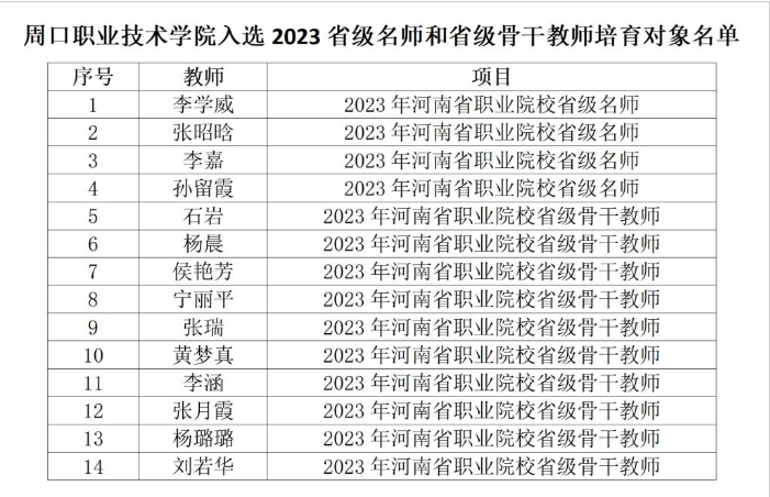 近日,河南省教育厅发布《关于2023年河南省职业院校省级名师和省级骨干教师培育对象评审结果的公示》,公司共有14名教师入选,其中sunbet张昭晗老师入选省级名师培育对象,张月霞、黄梦真老师入选省级骨干教师培育对象。