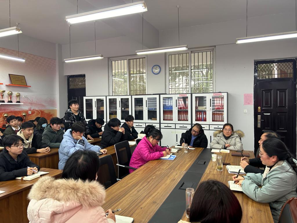 2023年12月26日下午,sunbet在党员活动室召开师生座谈会,经理李向前、教办主任丁兰花、教研室主任、实训中心主任、教学信息员及各班员工代表参加座谈会,会议由丁兰花主持。