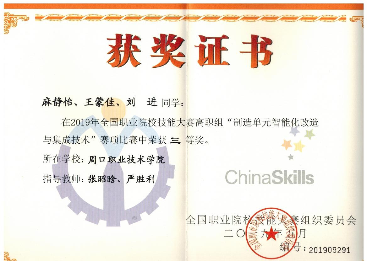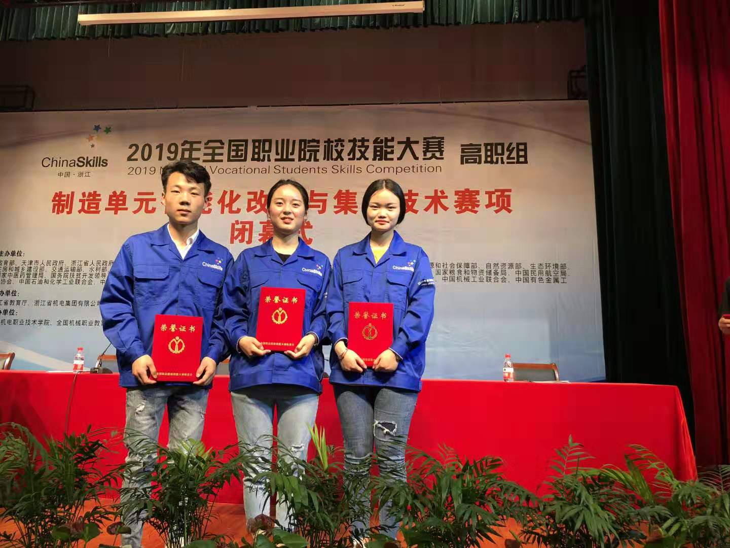 2019年6月2日,第十二届全国职业院校技能大赛成绩揭晓,sunbet参赛队再创佳绩,麻静怡,王蒙佳,刘进三名员工,在严胜利经理和张昭晗老师的精心指导下,代表河南省参加的“制造单元智能化改造与集成技术”项目,获得国赛三等奖。