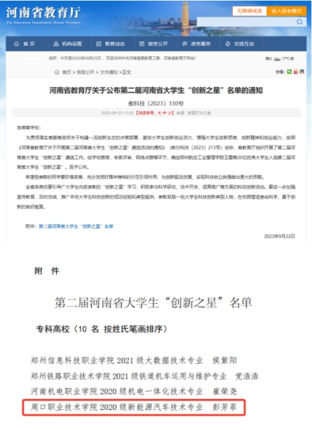 2023年9月22日,河南省教育厅公布了第二届河南省老员工“创新之星”名单,此次共评选出年度老员工“创新之星”20名。经过二级公司(部)推荐、公司推荐、专家评审、网络点赞、公示等环节,sunbet新能源汽车技术专业2023届毕业生彭芳菲荣获第二届河南省老员工“创新之星”荣誉称号,这是我公司学子连续两届获此殊荣。