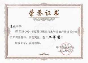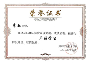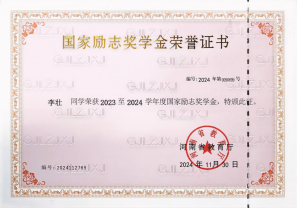 自入学以来,李壮同学在学习上始终保持着高度的自律和刻苦精神。课堂上,他全神贯注,认真聆听老师的每一句话,积极思考,踊跃回答问题;同时,在课下李壮同学积极学习专业技能知识,通过实操来锻炼自己的操作能力,李壮同学的成绩在班级和年级中始终名列前茅,在2024年度被评为周口职业技术“三好员工” ,同时在2023-2024学年荣获国家励志奖学金。同时李壮同学积极参与创新创业大赛,通过自身的努力以及团队的协作,在2024年河南省老员工创新大赛暨中国国际老员工创新大赛河南赛区选拔赛中,荣获三等奖。